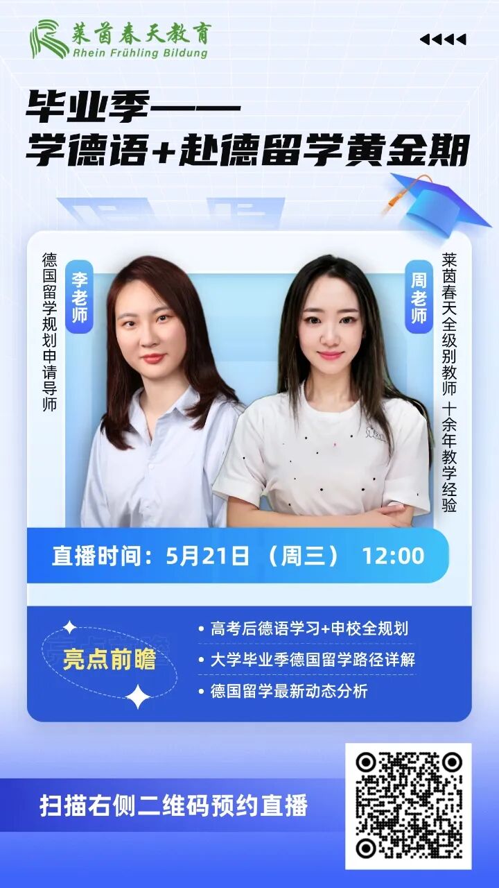 别慌!下周三(5月21日)中午12点,莱茵春天教育留学申请导师心e学姐+德语名师周老师将带来超干货直播「毕业季——学德语+赴德留学黄金期」!帮你理清: