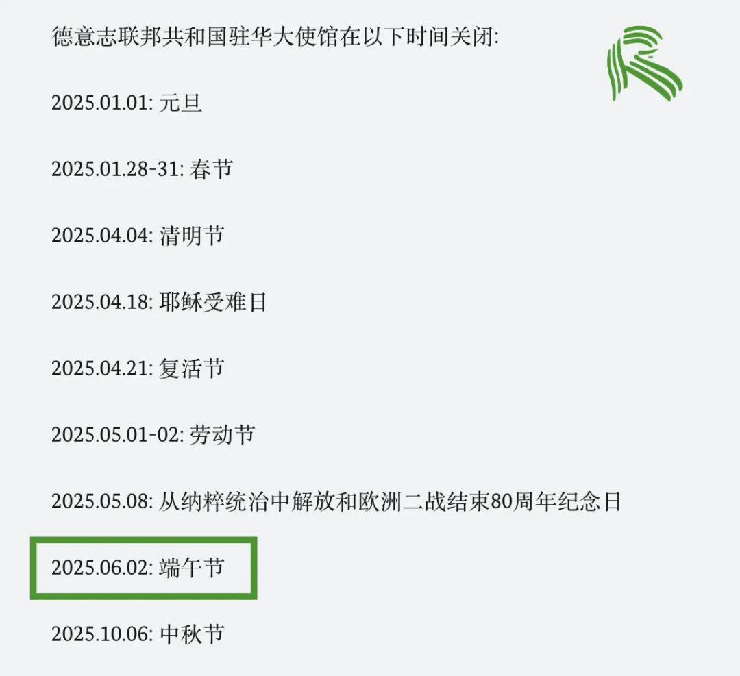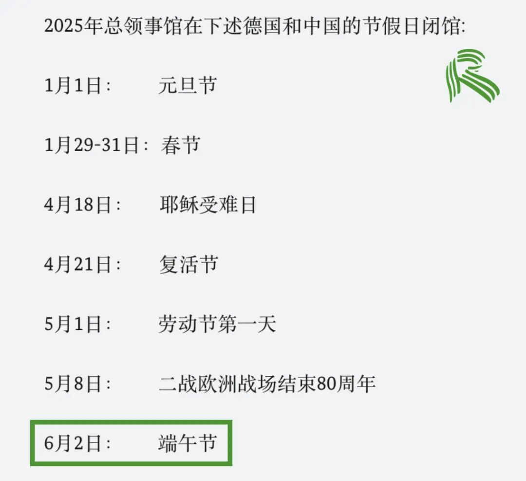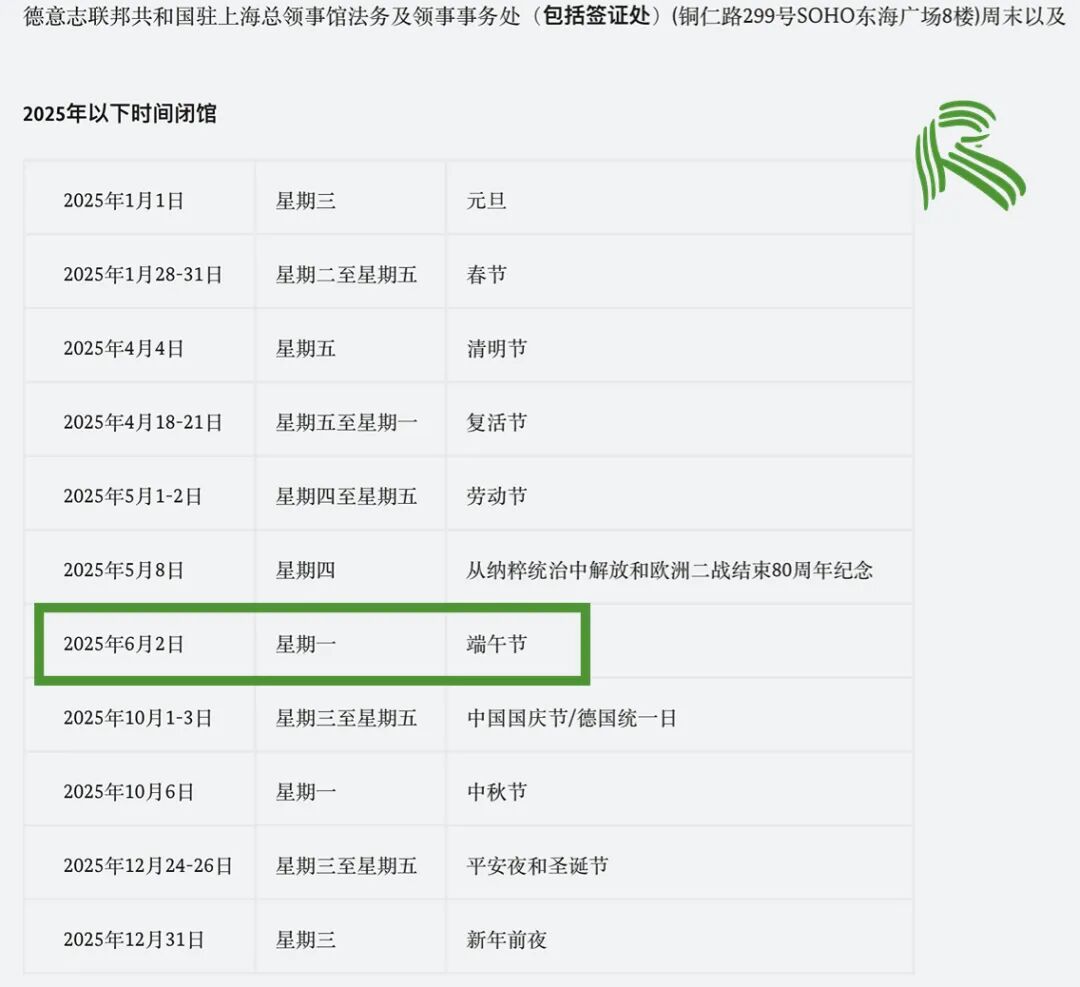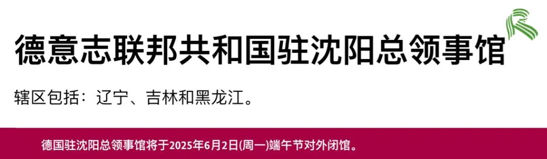 德国驻华各大使领馆已经APS审核部也将陆续闭馆。我们已为大家整理好闭馆时间表,近期准备办签证、APS审核等业务的小伙伴记得提前安排!闭馆时间:2025.05.29及06.02闭馆时间:2025.06.02闭馆时间:2025.06.02闭馆时间:2025.06.02闭馆时间:2025.06.02闭馆时间:2025.05.31-06.02