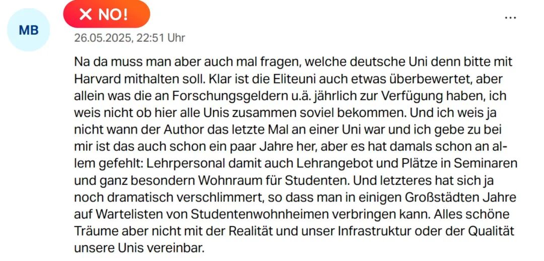 舆论:德国版“何不食肉糜”? 正当政界为“流亡校园”构想振奋时,德国社交平台掀起质疑声浪: “德国显然不缺待解的难题,政客们为何总想着拯救世界每个角落,却对自家问题视而不见?” “展现团结固然没错,但吸引更多海外学子前来,与本国学生争夺本就稀缺的优质大学名额——这该如何平衡?” “德国哪所大学真能跟哈佛相提并论?虽说确实有点被神化了,但光是每年的科研经费——我怀疑德国所有大学加起来都未必赶得上...... 师资不足导致开课有限,研讨课名额紧张,尤其是学生宿舍——现在情况更是雪上加霜,某些大城市的学生宿舍排队名单能等上好几年。这些构想固然美好,但跟我们大学的基础设施、教育质量根本不在一个次元!”