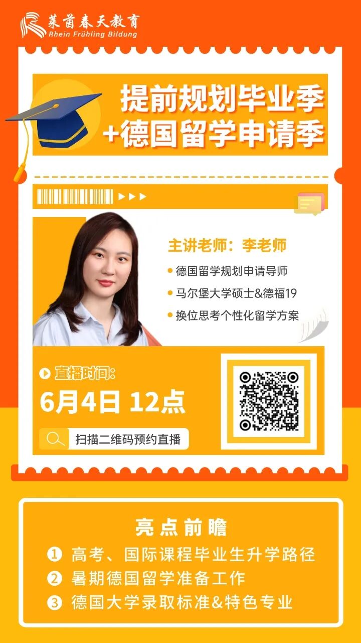 本周三(6月4日)中午12点,莱茵春天教育留学申请导师心e学姐将继续“周三固定环节”,带来超干货直播「提前规划:毕业季+德国留学申请季」!梳理德国留学的升学路径、申请时间规划、大学录取标准及特色专业选择,帮助大家把握最佳申请时机!