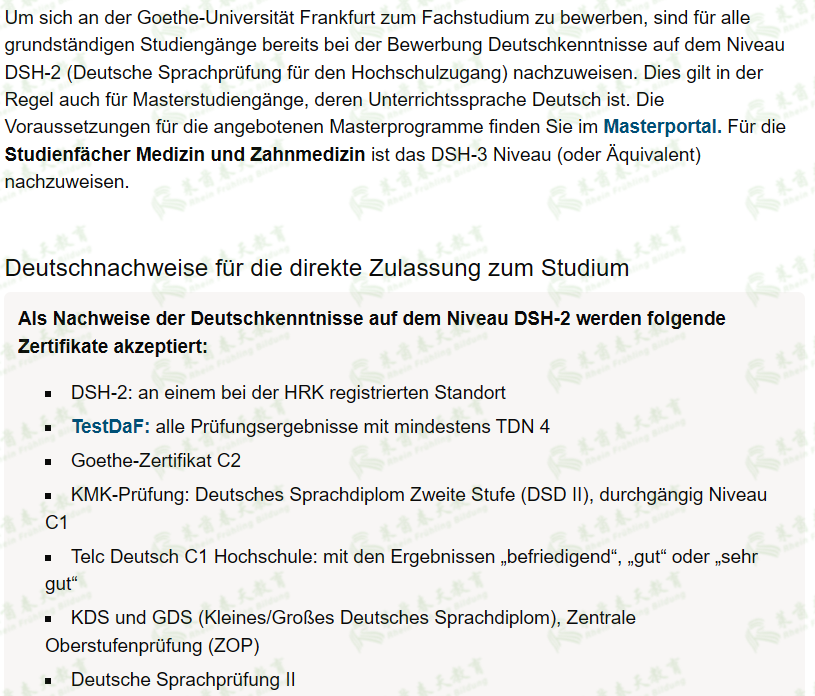 例如:法兰克福大学,所有本科专业申请者均须在提交申请时提供DSH-2级别(或同等水平)的德语水平证明,而医学和牙医学专业则要求申请者具备DSH-3级别(或同等水平)的德语能力证明。