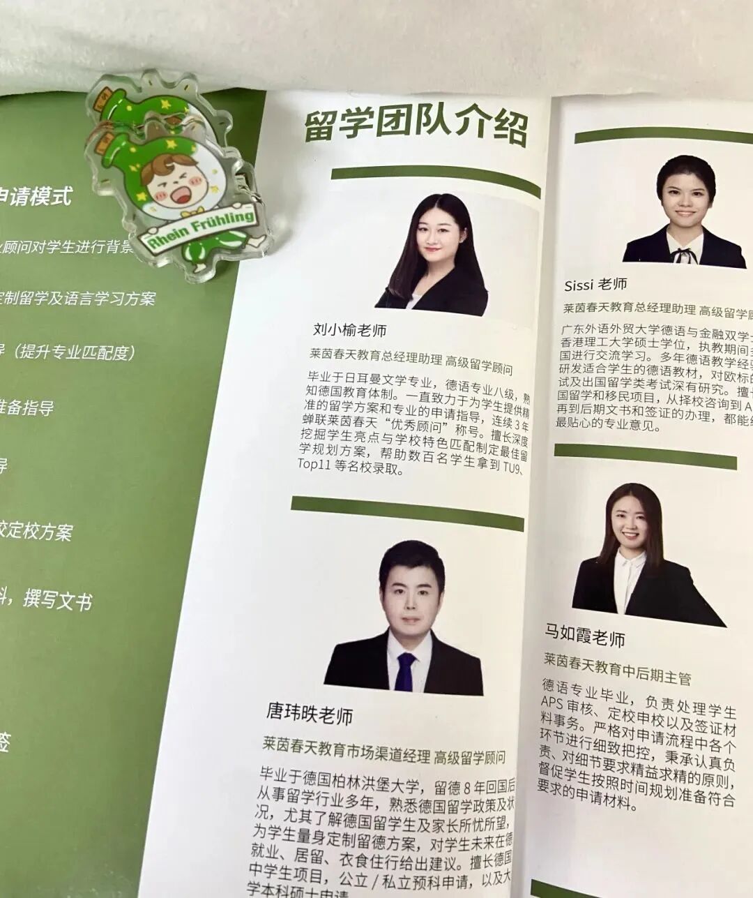 这些同学的成功案例 其实你也能复刻! 在留学追梦这条路上,莱茵学员从来都不是孤军奋战!莱茵春天教育留学团队,以严谨的态度、细致的服务和深厚的专业素养,始终与大家一路同行! 申请经验丰富,德国留学“老司机” (部分留学团队成员) 申请方案个性化,量身定制“留学秘籍”