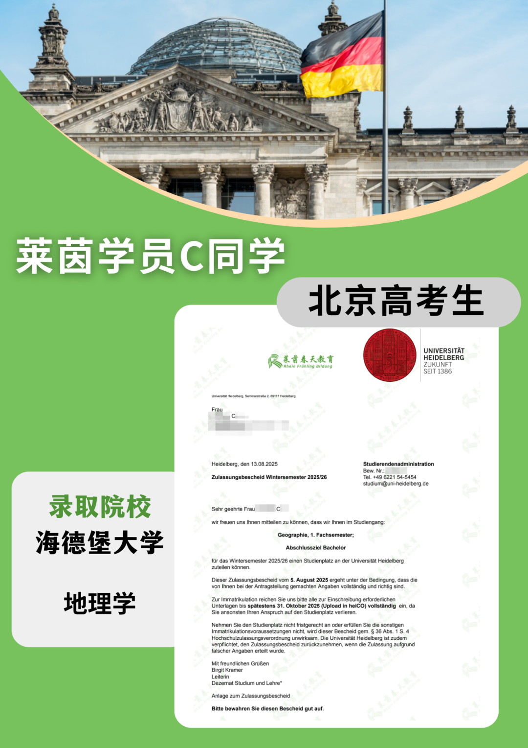 谁说德国只有工科强?海德堡大学——德国最古老的高校,其人文与理学同样声名显赫。这一次,我们有两位高考学员Q同学和C同学双双拿下地理学专业的录取!