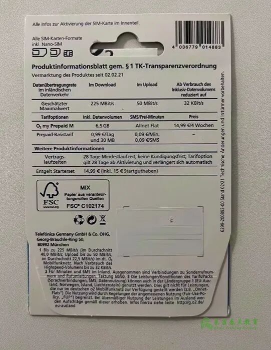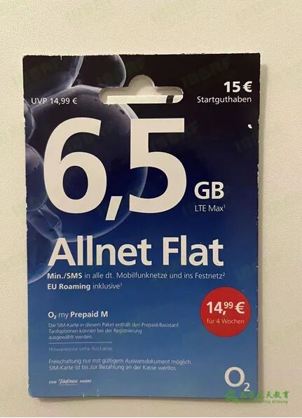 便利店购买的Prepaid-Karte,选择了O2运营商,6.5GB每月只需14.99欧元