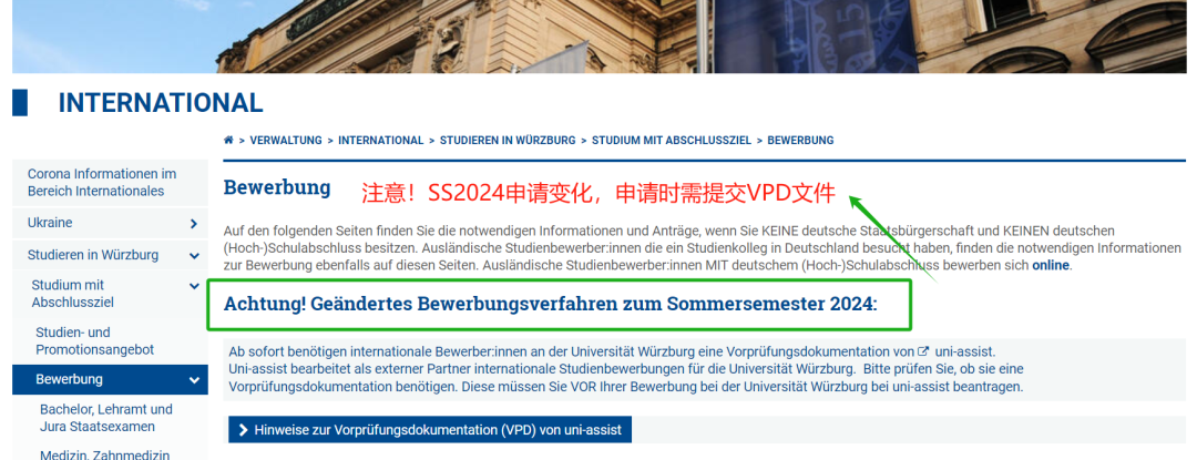 维尔茨堡大学(Universität Würzburg)从SS2024申请季开始,部分申请人在申请时将强制提交VPD文件。