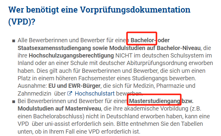 根据学校官网说明,本科的申请要求更严格,所有不是在德国国内系统及Abitur获得德国高等教育入学资格的申请人,都需提交VPD证明;硕士阶段则是 部分专业 需要提交VPD。对维尔茨堡大学的申请,VPD的有效期为一年。